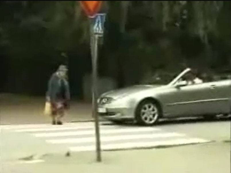 On y voit un automobiliste s’énerver contre une vielle dame qui s’apprête à emprunter un passage piéton. Le conducteur impétueux, manifestement agacé, accélère et klaxonne généreusement.