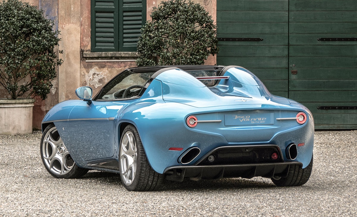 La version découvrable dénommée Disco Volante Spyder, présentée au Salon de Genève en 2016, 4 ans après le coupé, n’est pas en reste sur le plan esthétique. Elle intègre un double bossage arrière dans le prolongement des sièges conférant à l’ensemble un supplément d’âme néo-rétro. Et le toit amovible est composé de panneaux en fibre de carbone, gage de légèreté et de rigidité.
