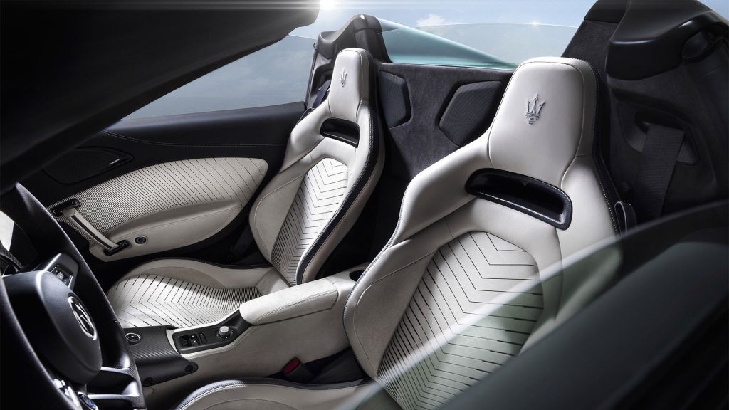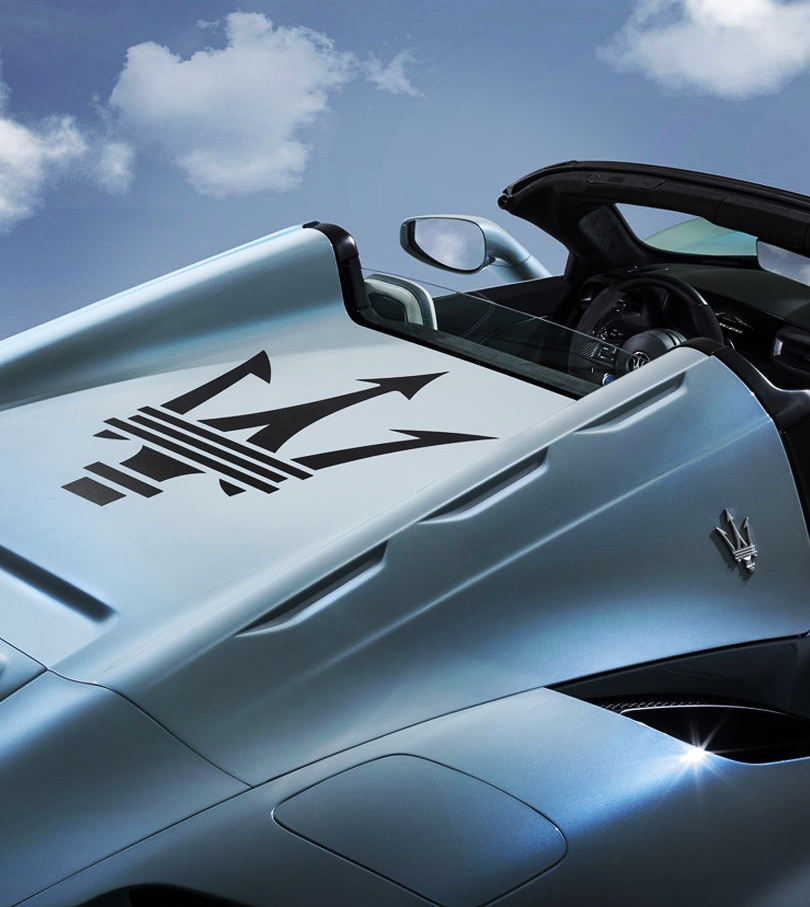 Elle profite bien entendu de la ligne de la MC20 coupé mais en donne plus encore grâce à un détail qui n’en est pas un : son magnifique double bossage à l’ancienne derrière les sièges, séparé par un trident peint version XXL. Il parachève harmonieusement la silhouette de cette supercar aussi élégante que racée.