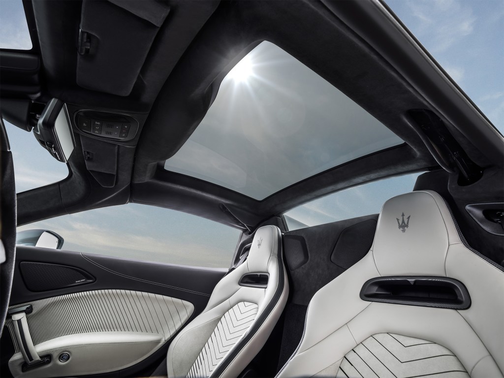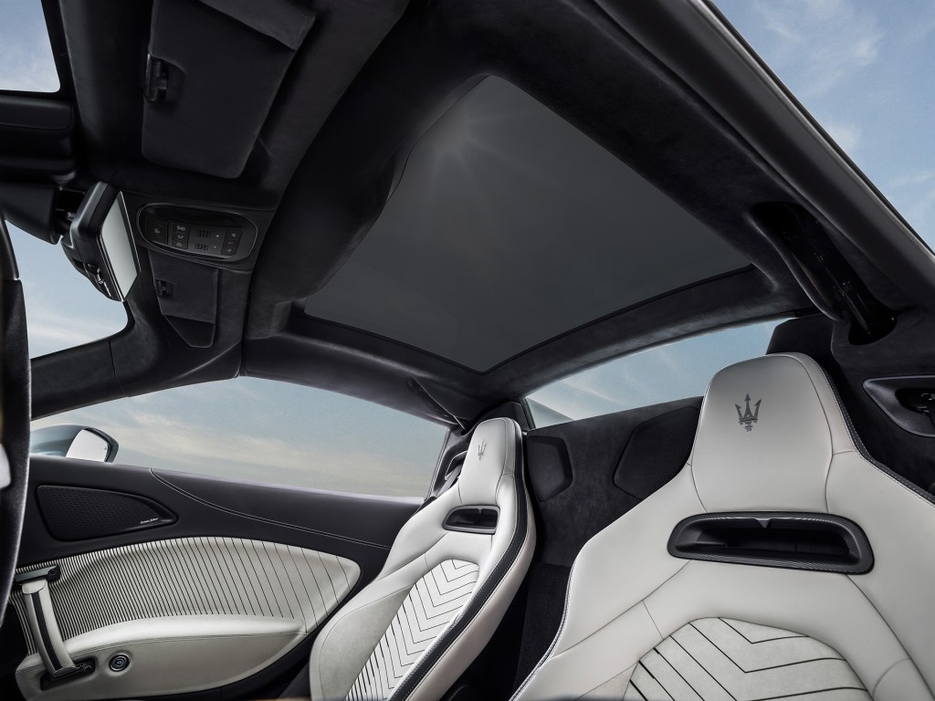 Le poids de la MC20 Cielo se veut contenu à 1540 kg selon Maserati, soit seulement 65 kg de plus que le coupé malgré l’adoption d’un toit en verre électrochromatique rétractable électriquement, capable au passage de s’ouvrir ou de se refermer en 12 s et de s’obscurcir à 97 %.