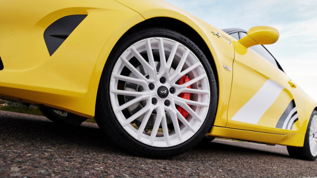 Les jantes blanches « Grand Prix » de 18 pouces et les étriers de frein Brembo oranges parachèvent l’aspect général généreusement évocateur du glorieux passé d’Alpine en rallye.