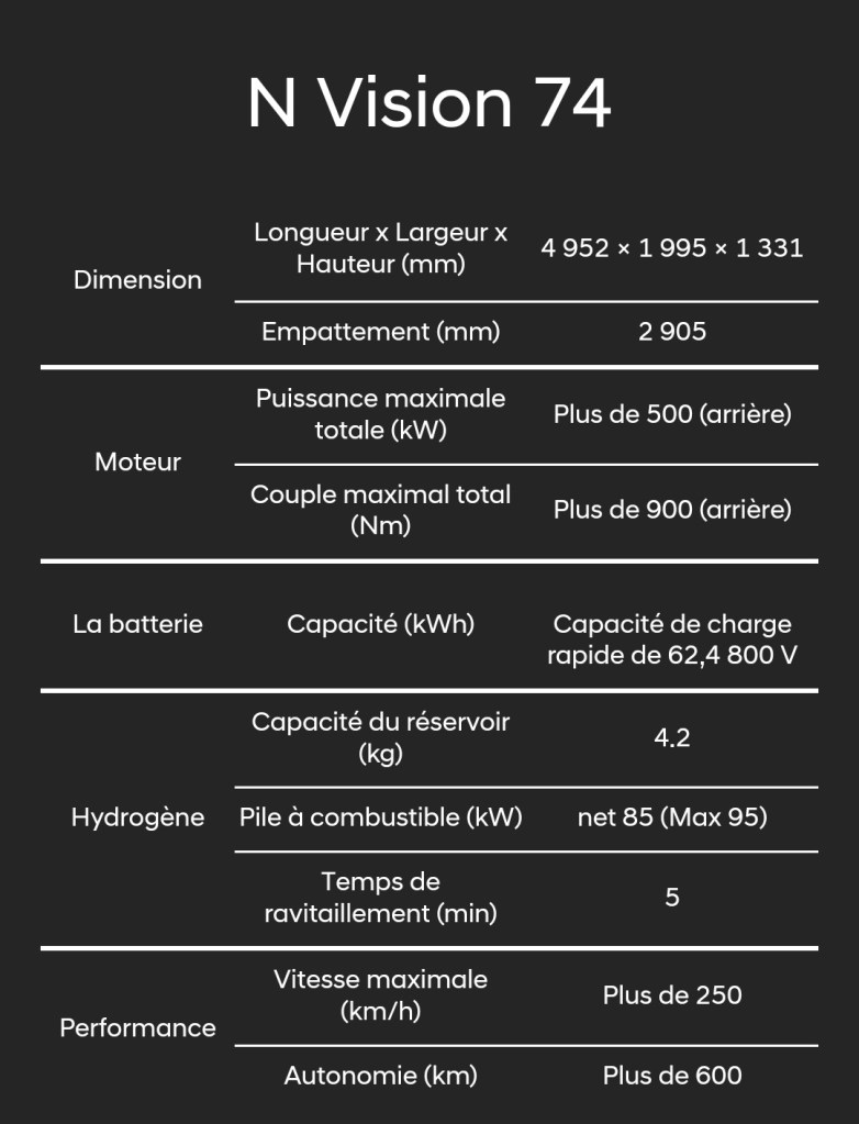 La N Vision 74 est un concept car hybride. Elle utilise notamment l’hydrogène, domaine dans lequel Hyundai est le pionnier puisqu’il a été le premier en 2013 à commercialiser une voiture de série, le ix35 Fuel Cell, fonctionnant avec cette énergie alternative.