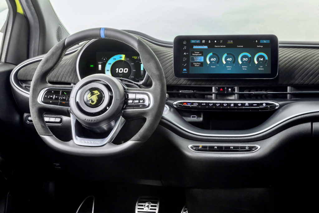 Pour cette première version électrique de la micro sportive, Abarth a davantage misé sur l’efficacité que sur la puissance avec un bloc motopropulseur développant « seulement » 154 ch (113 kW) et 235 Nm de couple. Un gain de 36 ch (26 kW) et 5 Nm par rapport à la plus musclée des Fiat 500e. Cela peut paraître décevant comparé à l’actuelle Abarth 695 affichant 180 ch (et même 190 ch en version Biposto) pour un poids de 1044 kg, soit près de 300 kg de moins que l’Abarth 500e (1320 kg).