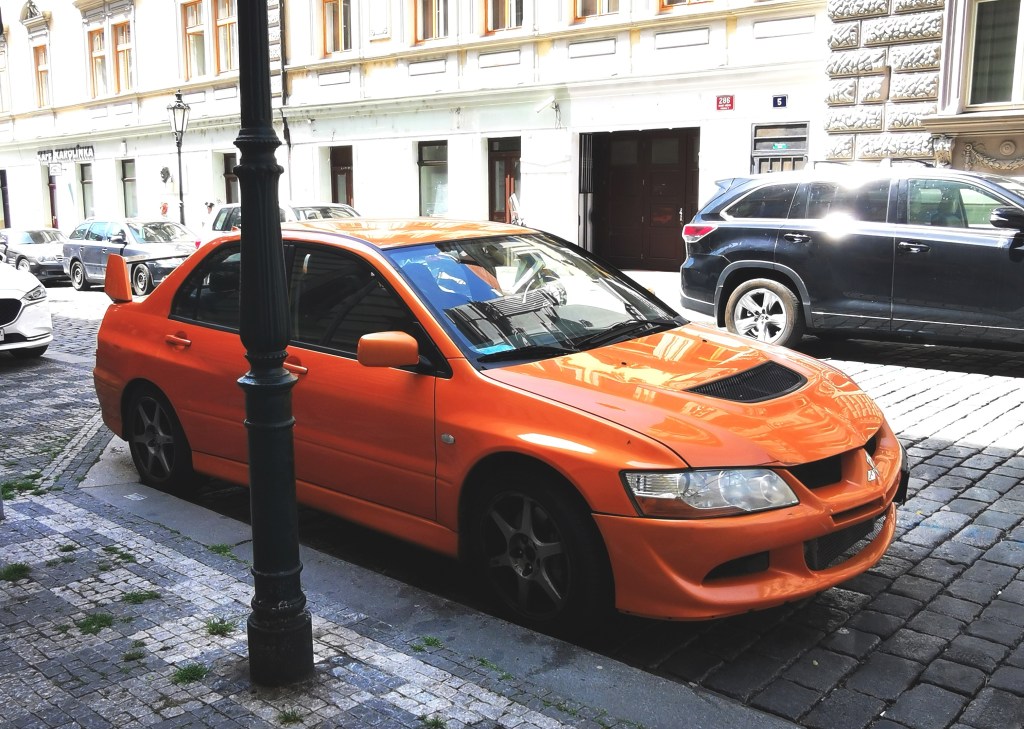 On évoque maintenant deux pépites à la philosophie bien différente qui n’ont pour seul point commun que d’avoir élu domicile à Prague. La Mitsubishi Lancer Evo VIII est une voiture rare sur nos routes, comme sa rivale d’alors, la Subaru Impreza WRX. Celle qui illustre cet article est dans un état moyen et arbore une livrée orange qui ne semble pas d’origine. Pour mouvoir la version civile de ce bolide à transmission intégrale qui a couru en rallye WRC, un quatre-cylindres à plat 2.0 turbo de 265 ch. De quoi accrocher 245 km/h et un joli chrono de 6,1 s sur le 0 à 100 km/h.