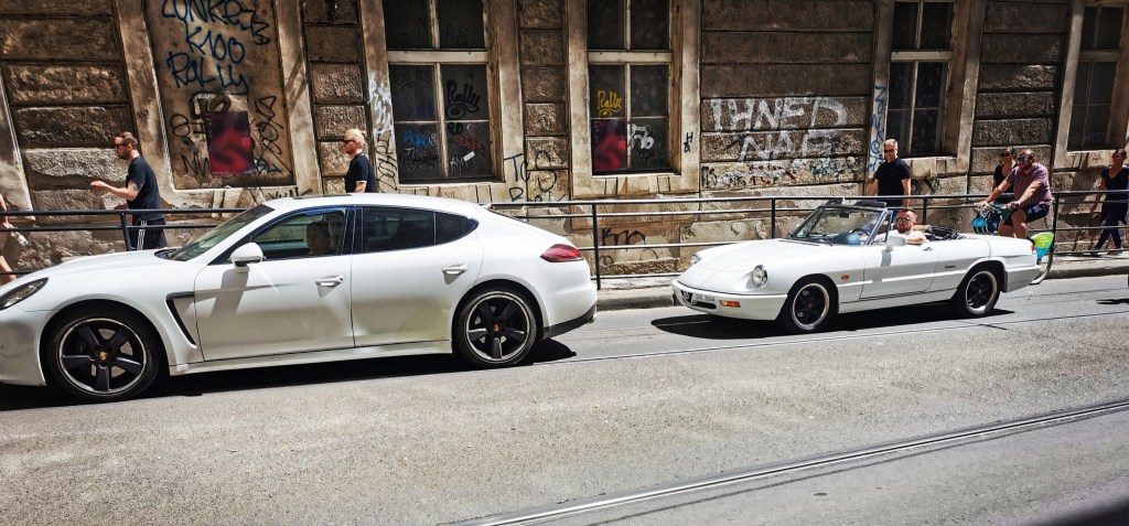 À Prague, point de complexe. Les voitures de tous horizons cohabitent sans la moindre arrière pensée. Au milieu des Skoda en surnombre, des Ferrari, Alfa Romeo, Porsche, Maserati font la causette dans des quartiers populaires ou huppés. Ce melting-pot automobile donne lieu à des scènes inattendues, comme en témoigne cette Alfa Romeo Spider des années 1990 côtoyant une Porsche Panamera contemporaine.