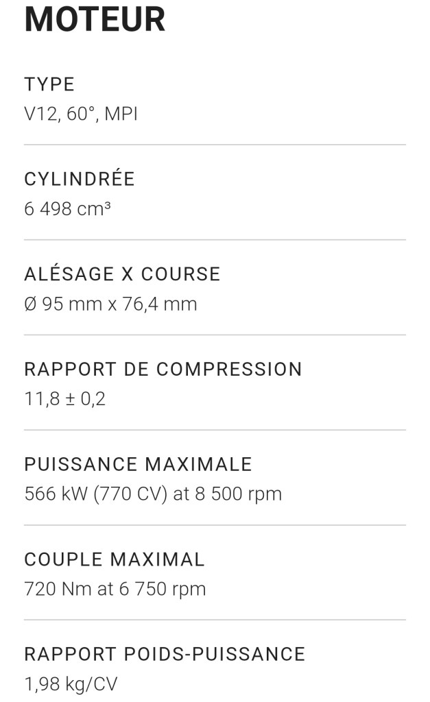 La fiche technique délirante de ce missile italien de la firme de Sant’Agata laisse rêveur. Le 0 à 100 km/h est bâclé en seulement 2,8 s, la vitesse de pointe étant annoncée sans plus de précisions comme « supérieure à 350 km/h ».